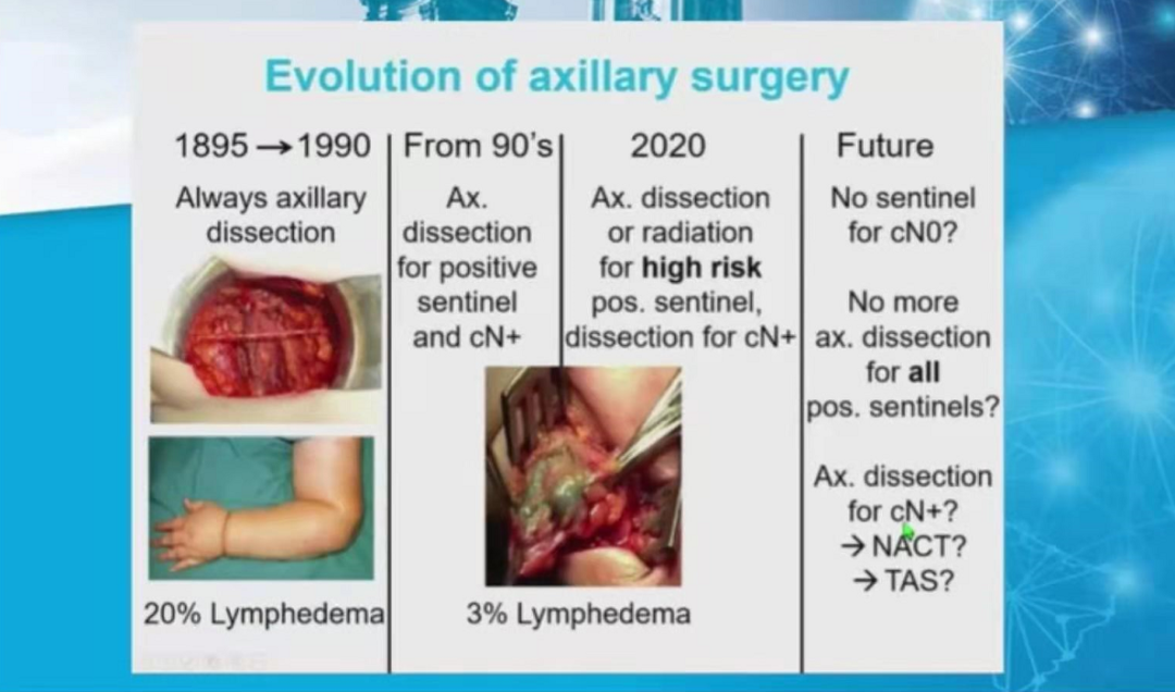 乳腺癌外科治疗经历一百多年的发展,腋窝处理的理念已经发生很大的变化。王永胜教授指出,自上世纪90年代以来,前哨淋巴结活检(SLNB)的临床应用,使得部分cN0分期的患者可以避免腋窝淋巴结清扫(ALND),或者以腋窝放疗替代。未来,我们或将通过精准诊断、新辅助治疗等手段进一步避免SLNB,即无需进行腋窝淋巴结的外科分期。