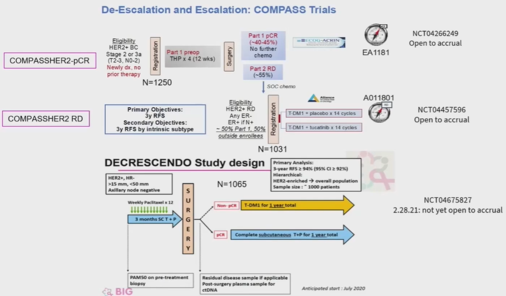 目前在HER2阳性早期乳腺癌中pCR与否对于指导后续辅助治疗决策具有重要作用,KATHERINE研究证实,新辅助治疗后non-pCR的HER2阳性乳腺癌患者(无论激素受体状态如何)接受强化辅助治疗,可显著降低复发或死亡风险。而对于双靶新辅助治疗后达到pCR的患者术后辅助阶段是否可以进行“减法”治疗,临床实践中不建议,未来仍需进一步探索。