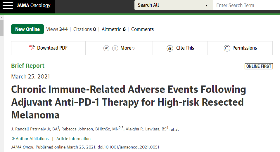 考虑到后续治疗的频率以及与疾病相关的并发症和死亡时间,在晚期黑色素瘤患者中描述长期irAE具有挑战性。因此,美国和澳大利亚学者通过回顾性数据分析,在一项大型的多中心队列研究中,确定了慢性irAEs的频率、发生率、时间过程和相关性。并对使用辅助抗PD-1治疗的黑色素瘤患者进行了研究,以更准确地描述持续的irAEs。