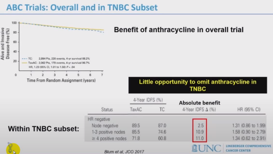 首先对于蒽环类降阶梯。袁芃教授表示蒽环类联合紫杉类药物是早期TNBC辅助治疗的标准方案,但蒽环类药物却因心脏毒性、消化道毒性备受争议。在ABC研究的TNBC亚组中,患者淋巴结阳性数目越少,含蒽环辅助治疗方案较不含蒽环方案的绝对获益越小。因此,袁芃教授与张剑教授均认为,对于如1期、Ki67较低等复发风险较小患者,可以考虑蒽环降阶梯;而对于淋巴结阳性的患者,蒽环类药物仍不可或缺。