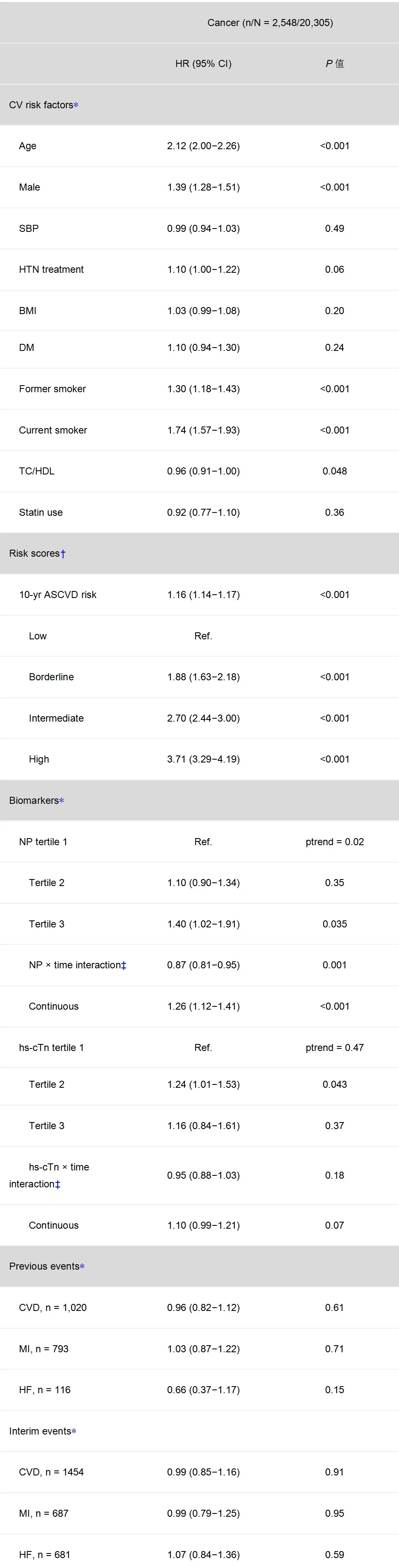 传统的CVD风险因素,包括年龄、性别和吸烟状况,都与癌症发生率独立相关(P值均<0.001);