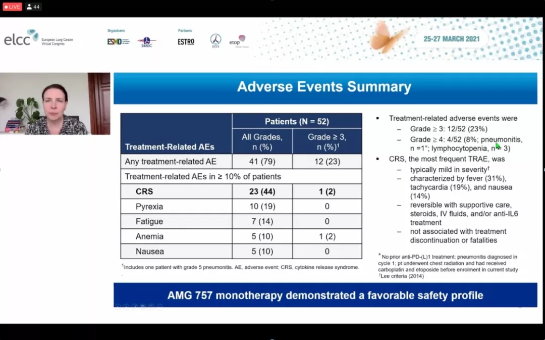 这项多中心、非盲I期研究纳入52例小细胞肺癌患者,评估AMG757在接受≥1线铂类化疗后复发/难治性SCLC患者中的安全性和疗效。患者静脉注射AMG 757(9个剂量水平;剂量范围:0.003-30 mg q2w,±阶梯式给药)。主要终点是安全性和耐受性,以及确定最大耐受剂量或II期推荐剂量。截至2020年11月3日,共纳入52例患者(中位年龄为64岁;中位治疗线数为2),大多数(98%)患者ECOG PS评分为0或1。44%患者先前接受过PD-1/PD-L1抑制剂治疗。此外,96%的患者在最初诊断时为广泛期SCLC,25%有脑转移,48%有肝转移。