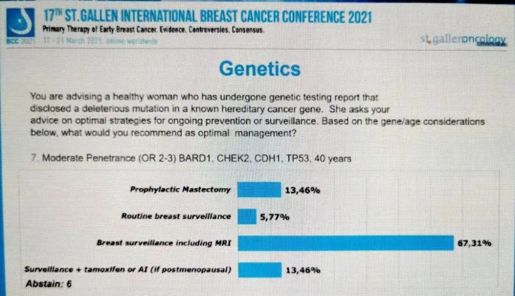 徐莹莹教授对管理措施予以补充,若是高致病风险突变的乳腺癌患者,无家族史可考虑保乳手术;若是高致病风险突变的健康人群,则预防切除的推荐力度更弱,可进行每年钼靶或MRI筛查。在SG-BCC投票中,欧美专家对高龄患者更倾向于常规监测而非MRI,其原因可能是因为高龄患者乳腺脂肪化后致密程度低,常规监测即可。