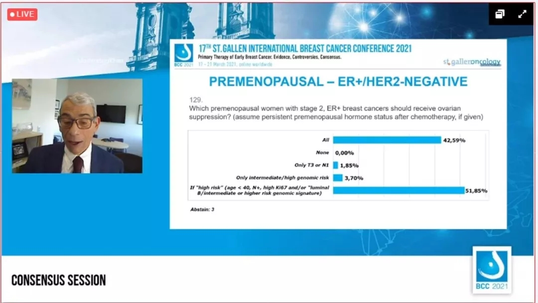 哪些临床分期为2期的绝经前ER+女性应该接受卵巢抑制?(如果给予,假设化疗后持续处于绝经前激素状态)。42.59%的专家选择“所有患者”,1.85%的专家选择“仅T3或N1”,3.70%的专家选择“仅中/高风险”,51.85%的患者选择“如果高风险(年龄<40岁,N+,高KI67和/或luminal B/中或高基因组特征)”,3人弃权。