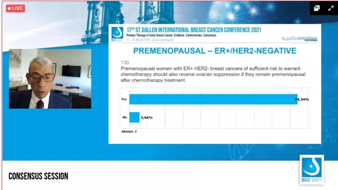 年龄<40岁、临床分期为2期的ER+绝经前乳腺癌患者,应该接受卵巢抑制吗?94.34%的专家选择“是”,5.66%的专家选择“否”,4人弃权。