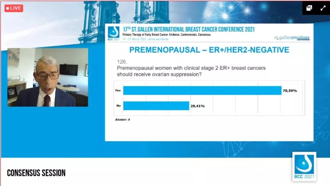 关于OFS的共识投票中,对于临床分期为2期的ER+绝经前乳腺癌患者应该接受卵巢抑制,70.59%的专家选择“是”,29.41%的专家选择“否”,4人弃权。