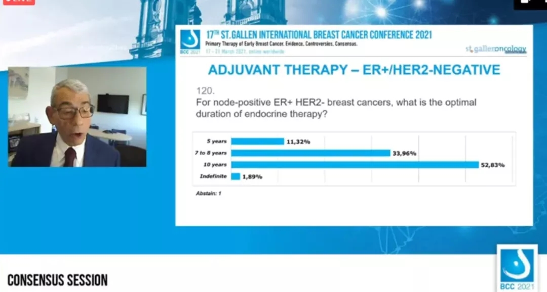 金锋教授:中国绝经前女性早期乳腺癌患者中50%~60%激素受体为阳性,辅助内分泌治疗是降低这类患者复发风险的重要手段。辅助治疗的时长问题一直有所争议,本次大会对淋巴结阳性、HR+/HER2-乳腺癌患者内分泌治疗最佳的时长进行投票,11.32%的专家认为是5年,33.96%的专家认为是7-8年,52.83%的专家认为是10年,我认为还是应该从患者的年龄、复发风险等角度综合考量来决定内分泌治疗的时长。