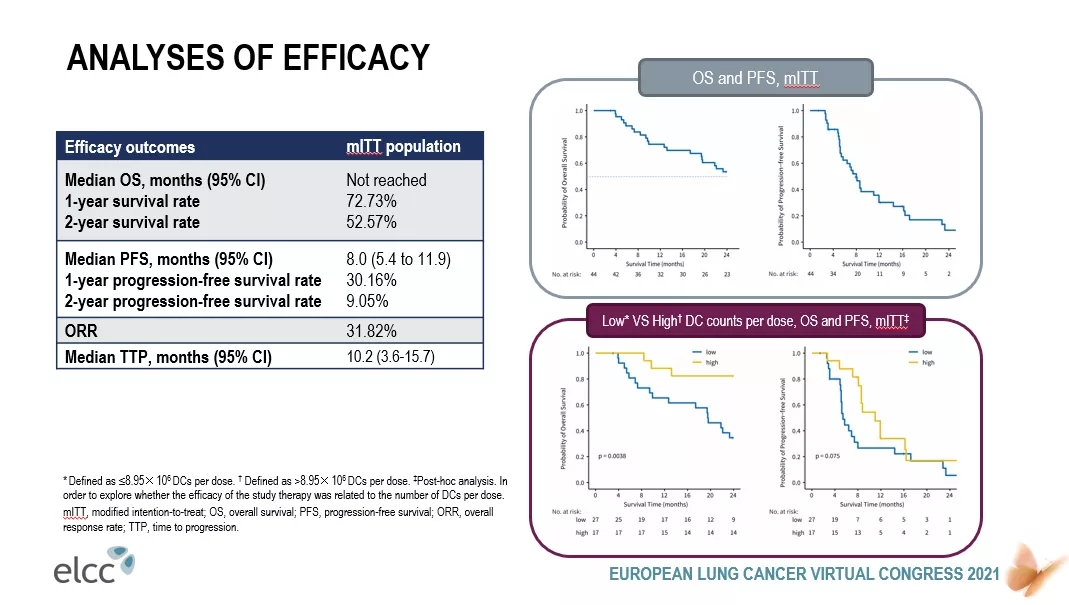 本单臂研究纳入61例EGFR、ALK阴性非鳞非小细胞肺癌(NSCLC)患者,探究DC疫苗DCVAC/LuCa(即Dendritic Cell Vaccine for Lung Cancer)联合化疗作为一线治疗方案在此类患者中的疗效和安全性。