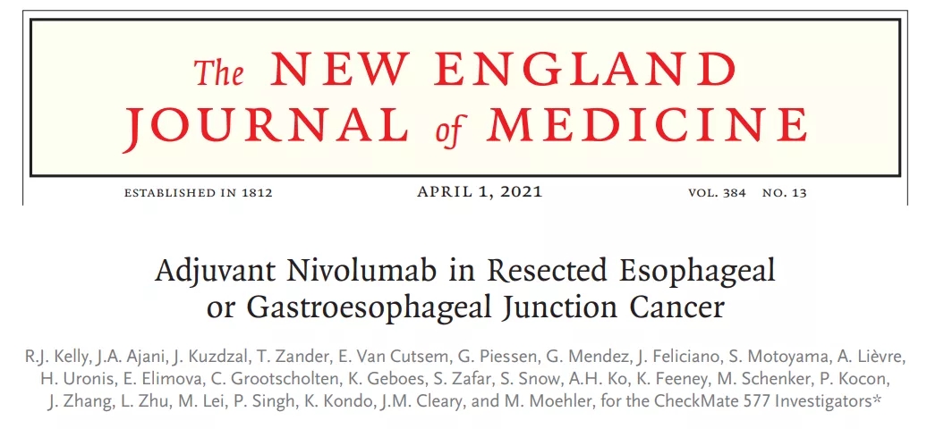 Ronan J. Kelly, et al. Adjuvant Nivolumab in Resected Esophageal or Gastroesophageal Junction Cancer. April 1, 2021. N Engl J Med 2021; 384:1191-1203