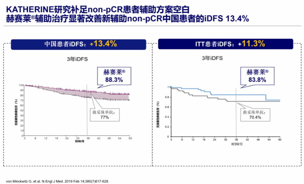 新辅助治疗后仍有残存病灶(non-pCR)的患者,其长期预后较差,不良事件发生率更高,从而拉低了早期乳腺癌患者的治愈比例。KATHERINE研究对这部分人群进行了研究,并将其随机分为两组,分别给予T-DM1和曲妥珠单抗进行抗HER2治疗。研究结果显示,T-DM1组3年iDFS相较于曲妥珠单抗组提高了11.3%(88.3% vs. 77.0%)T-DM1组疾病复发、死亡风险较曲妥珠单抗组降低50%(HR 0.50;95%CI:0.39~0.64;P<0.001)。且该研究中入组的中国人群与总人群治疗的效果相当,3年iDFS提高了13.4%。