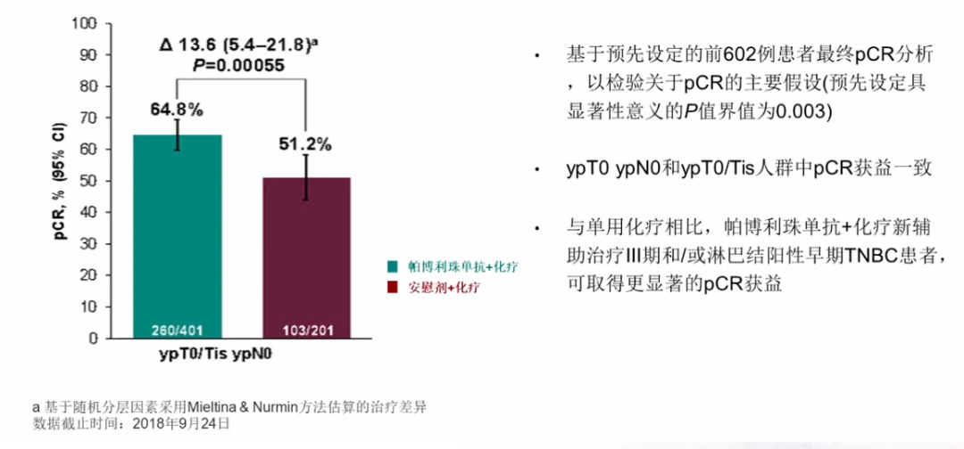 IMpassion031研究是一项多中心,随机,双盲的Ⅲ期临床研究,旨在评估阿替利珠单抗联合化疗在早期TNBC新辅助治疗中的疗效和安全性。该研究结果显示,阿替利珠单抗联合化疗组和安慰剂联合化疗组分别有57.6%和41.1%患者观察到pCR(P=0.0044),次要研究终点PD-L1阳性患者与ITT人群pCR获益一致(68.8% vs 49.3%,P=0.021)。无论PD-L1状态如何,阿替利珠单抗联合化疗作为术前新辅助治疗,都能带来更高的pCR率,且安全性可接受。但很遗憾,该研究并未使我们看到生存方面的获益。