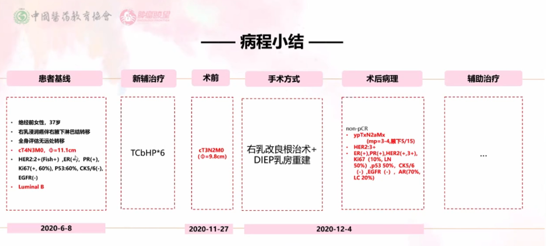 天津医科大学肿瘤医院陈翱翔教授汇报了一例右乳浸润性癌伴右腋下淋巴结转移的Luminal B型(HER2+)(IIC期)T4N3M0 患者的治疗病例,该患者经TCbHP新辅助治疗后行右乳改良根治术+DIEP乳房重建,术后病理示:non-pCR。随后,天津医科大学肿瘤医院郝春芳教授就“蒽环方案在新辅助治疗中的地位、HR+/HER2+乳腺癌新辅后non-pCR的强化治疗选择、MP=4患者辅助强化方案选择”进行了基于循证医学证据的解析。最后,关于患者的辅助治疗方案,她得出结论:从证据级别来看,应优选T-DM1,PH双靶次之。