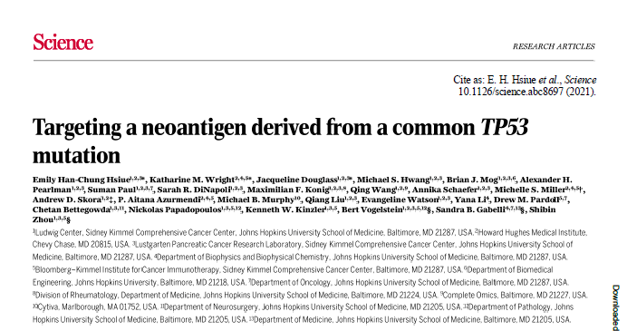 TP53是最早发现的肿瘤抑制基因之一,也是最常见的肿瘤突变基因。50%以上的非小细胞肺癌、食管癌、结直肠癌和头颈部鳞癌发生TP53基因突变,子宫内膜癌中其检出率高达80%以上。然而,由TP53基因编码的p53蛋白为核内蛋白,传统的抗体或小分子药物难以靶向。因此,在癌症免疫药物研究领域,p53蛋白是一个一直未能攻克的靶点。