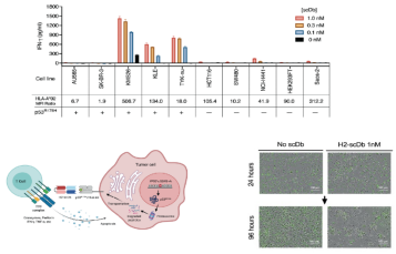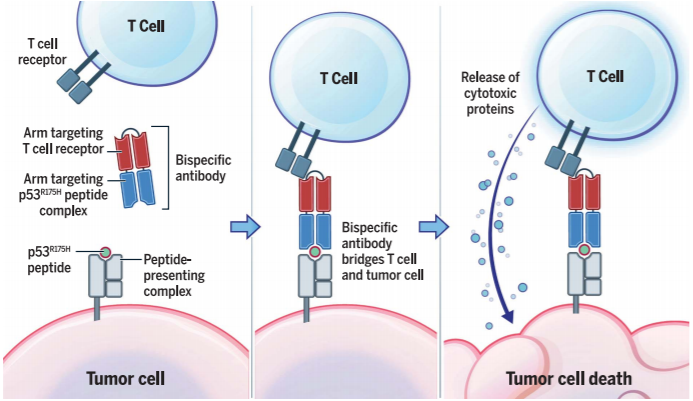 2021 年 3 月,美国约翰霍普金斯大学医学院 Bert Vogelstein、Sandra B.Babelli和Shibin Zhou教授的团队成功研制出了一种靶向TP53基因常见突变的双特异性单链抗体(bispecific single-chain diabody,scDb),并证实了该双特异性抗体可以有效识别含有突变型p53的肿瘤细胞,激活T细胞以发挥抗肿瘤效应(图1)。鉴于这种双特异性抗体可以靶向传统方法难以瞄准的肿瘤细胞内抗原,由此揭开了多种抑癌基因驱动肿瘤的治疗新篇章,该研究成果也以“Targeting a neoantigen derived from a common TP53 mutation”为题于2021年3月1日发表在Science 上。