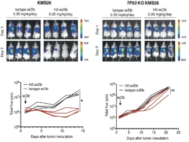 研究者利用噬菌体文库筛选鉴定出 H2抗体克隆,它是一种与p53R175H/HLA-A*02:01复合物具有高亲和力但不与野生型p53蛋白结合的抗体片段。随后,研究者将H2抗体克隆与抗CD3抗体片段融合在一起,成功构建了一种可以连接p53R175H/HLA-A*02:01复合物和T细胞的双特异性单链抗体(H2-scDb),重新引导T细胞识别TP53R175H肿瘤细胞。研究者通过体外共培养实验验证了H2-scDb对肿瘤细胞的识别具有HLA-A*02:01和TP53R175H的限制性,两者缺一不可;H2-scDb促进T细胞释放颗粒酶 B、穿孔素、IFN-γ等多种细胞因子杀伤靶细胞(图2)。体内实验也验证了H2-scDb的抗肿瘤作用(图3)。随后,研究者基于抗体的结构对可能的交叉反应表位进行了检测和验证。结果显示,H2-scDb的特异性良好,并不会诱导交叉反应(图4)。