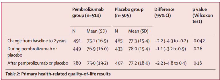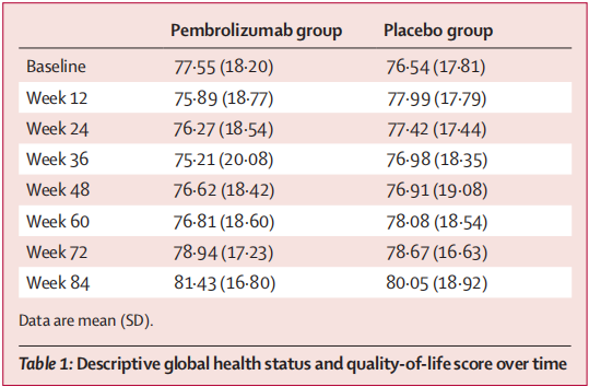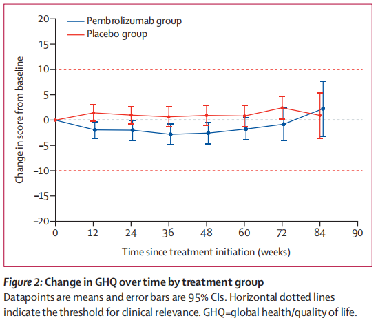 患者被随机分配(1:1)至Pembrolizumab 200 mg组或安慰剂组,每3周静脉给药一次,持续1年,直至疾病复发或出现不可接受的毒性或死亡。根据疾病分期和地区,使用最小化方法对随机化进行分层。研究的主要终点是无复发生存率。HRQOL是一个预先设定的探索性终点,用EORTC QLQ-C30量表测量超过2年的全球健康/生活质量(GHQ)作为主要分析指标,对意向治疗人群进行分析。