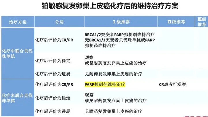 BRCA1/2突变患者化疗期间未使用贝伐珠单抗的患者,化疗结束后经评价达到完全缓解的患者:保留PARP抑制剂维持治疗的选择,删除了“观察(II级推荐)”。