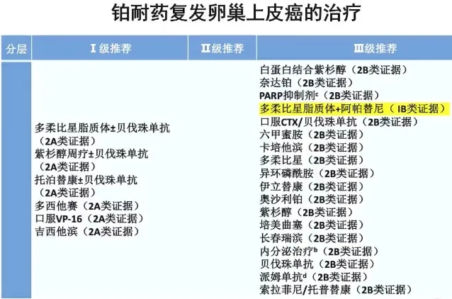 铂敏感复发卵巢上皮癌治疗的III级推荐中,BRCA1/2突变携带者的治疗选择中新增氟唑帕利。