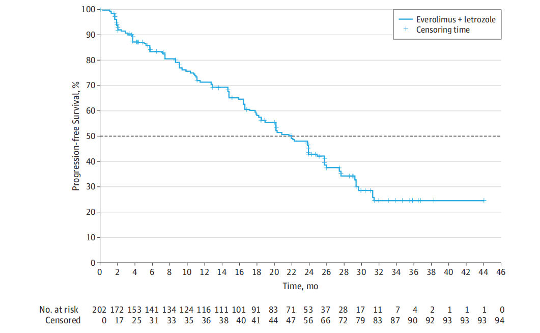 图5. BOLERO-4研究依维莫司一线治疗的PFS生存曲线