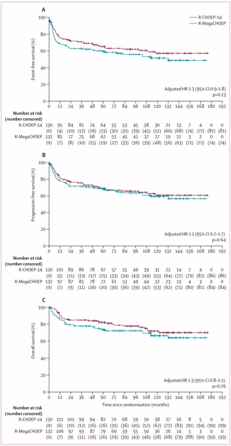 中位随访9.3年(范围:5.1-11.1年)后,R-MegaCHOEP组和R-CHOEP-14组患者的10年EFS率分别为51%(95%CI:42-61)和57%(95%CI:47-67)(log-rank p=0.21;调整后的危险比[HR]:1.3 [95%CI:0.9-1.8],p=0.23;图1A)。R-MegaCHOEP组和R-CHOEP-14组患者的10年PFS率分别为59%(95%CI:50-68)和60%(95%CI:51-70)(log-rank p=0.60;调整后的HR:1.1 [0.7-1.7],p=0·64;图1B)。R-MegaCHOEP组和R-CHOEP-14组患者的10年OS率分别为66%(95%CI:57–76%)和72%(95%CI:63–81)(log-rank p=0.25;调整后的HR:1.3 [0.8-2.1],p=0.26;图1C)。