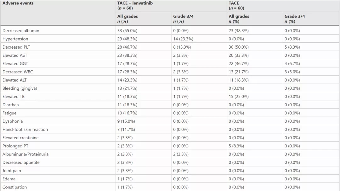从安全性来看,TACE+仑伐替尼组最常见的不良事件为白蛋白减少(55.0% vs. 38.3%)、高血压(48.3% vs. 0)、血小板减少(46.7% vs. 50.0%),最常见的3~4级不良事件为高血压(23.3%),但整体安全性仍可接受,未出现新的安全性信号。TACE+仑伐替尼组,较单独TACE组明显增加的不良事件有高血压、牙龈出血、腹泻、乏力、语言障碍、手足综合征等,以上不良事件可能与加用仑伐替尼有关。