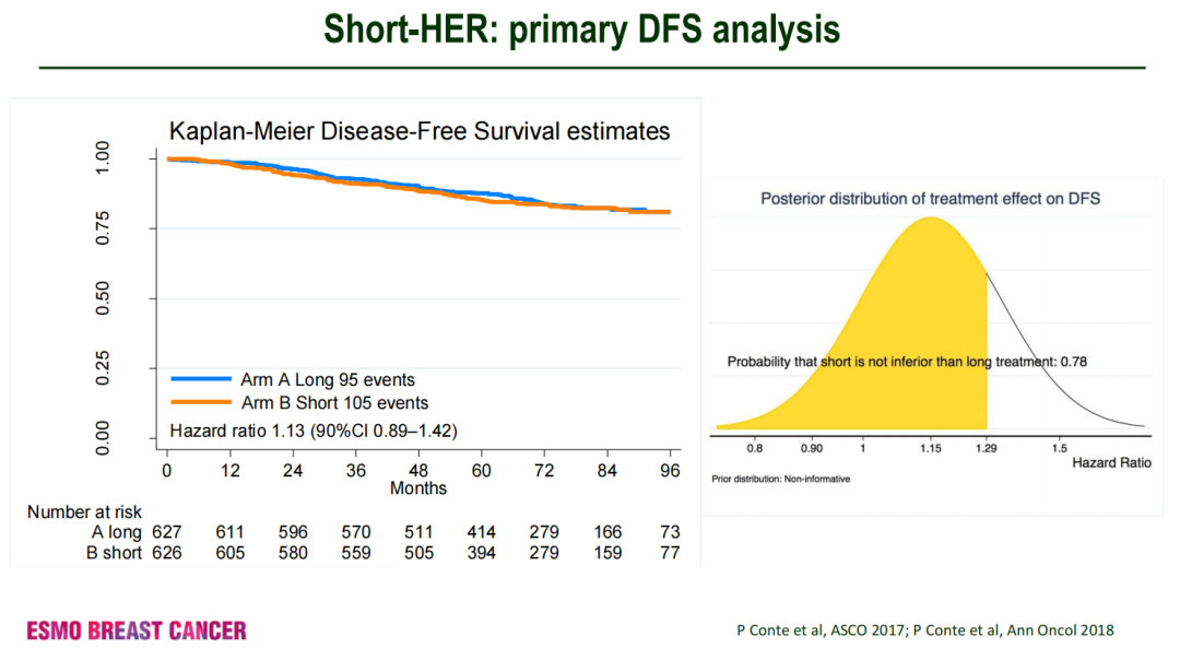 ShortHER是一项意大利多中心开展的Ⅲ期随机非劣效临床研究,目的是证明术后9周曲妥珠单抗辅助治疗非劣效于1年。研究入组人群为HER2阳性的早期乳腺癌淋巴结转移或者淋巴结阴性,但是至少有一个危险因素的患者,如肿瘤大于2cm、病理分级三级、淋巴脉管浸润、Ki67>20%或者年龄<35岁,激素受体为阴性患者。最终,该研究入组82个中心的1254例HER2阳性早期乳腺癌患者,并将其随机分为化疗+辅助9周曲妥珠单抗组(短程)vs 1年曲妥珠单抗组(长程)。主要终点为无病生存率(DFS),研究预设研究的非劣效界值为HR<1.29。