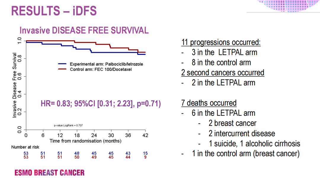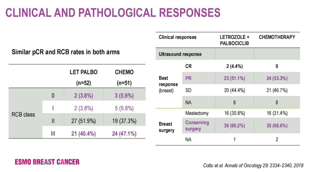 NeoPAL(UCBG104,NCT02400567)是一项随机、平行、非对照的II期研究。来自于法国和比利时22个研究中心的106名ER阳性,HER2阴性,Luminal B型或Luminal A且淋巴结阳性的II-III期绝经后女性乳腺癌患者以1:1比例随机分配到来曲唑-哌柏西利组(LETPAL)和化疗组(CT)。整个人群的中位年龄63岁,两组间的肿瘤特征很均衡,以高风险的Luminal B型为主。LETPAL组给予来曲唑(每日2.5 mg)和哌柏西利(每日125 mg,口服3周停1周);CT组给予FEC*3续贯T*3方案化疗(5FU 500mg/m2,表柔比星100mg/m2,环磷酰胺500mg/m2,多西他赛100mg/m2每3周1次),总治疗时间19周,随后进行乳房手术。主要研究终点为残留肿瘤负荷(RCB),次要终点包括无进展生存期(PFS)和无侵袭性疾病生存期(iDFS)。