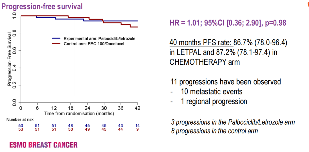 中位随访时间40.4个月。共11人出现疾病进展,其中3人在LETPAL组,8人在CT组。LETPAL组中有23例接受了术后辅助化疗。最终分析中,LETPAL组中的4位(7.7%,95%CI:0.4~14.9)和CT组中的8位(15.7%,95%CI:5.7~25.7)获得了局部评估RCB 0-I的肿瘤反应,两组评估结果近乎相同(kappa一致性检验= 0.792,95%CI:0.36~1.00)。患者PFS(HR = 1.01;95%CI:0.36~2.90,P=0.98)和iDFS(HR= 0.83;95%CI:0.31~2.23,P=0.71)在组间没有差异。LETPAL组和CT组40个月的PFS率分别为86.7%(78.0~96.4)和87.2%(78.1~97.4)。两组患者40.4个月的随访PFS并无明显不同,提示来曲唑-哌柏西利这一新辅助治疗策略的应用,可使部分Luminal型患者免于接受化疗的同时可能获得良好的长期疗效。对于ER+/HER2-患者的新辅助治疗,除化疗外,我们又多了一种低毒而且有效的选择。