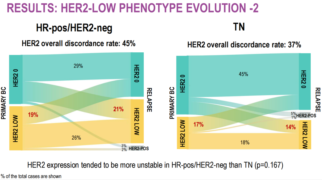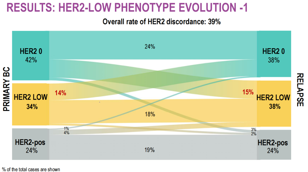 编者按:约有一半的分类为HER2阴性的乳腺癌表现出HER2低表达(IHC1+或IHC2+和ISH阴性),这种表达的乳腺癌患者可经新的抗体-偶联药物靶向治疗。而目前没有关于HER2低表达状态从原发肿瘤到复发的演变数据。意大利研究者对该类乳腺癌进行了探索,并将研究结果在本届ESMO BC大会上进行了披露。