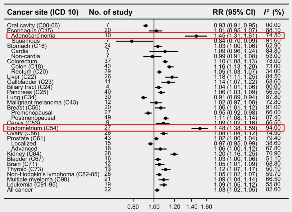 ◆ 甲状腺癌:较高的BMI(特别是BMI增加5个单位)与患甲状腺癌的风险轻度增加(10%)相关[19]。