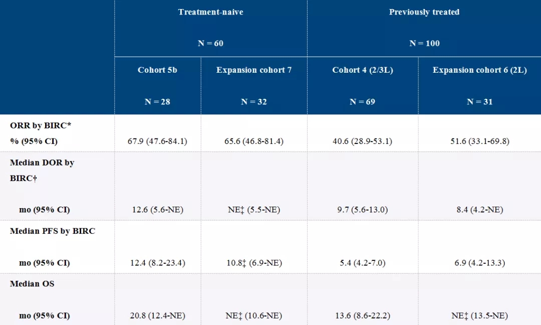 方法:在GEOMETRY mono-1中,根据既往治疗线数和MET状态(METex14或MET扩增)将患者分组。此次疗效分析包括METex14 NSCLC初治患者(队列5b和7)和既往接受过一线或二线治疗的晚期NSCLC患者(扩展队列6和队列4)(数据截止日期:2020年9月18日)。评估结果包括BIRC评估的总体缓解率(ORR)、缓解持续时间(DOR)和无进展生存期(PFS),以及总生存(OS)。安全性分析包括所有入组的患者。