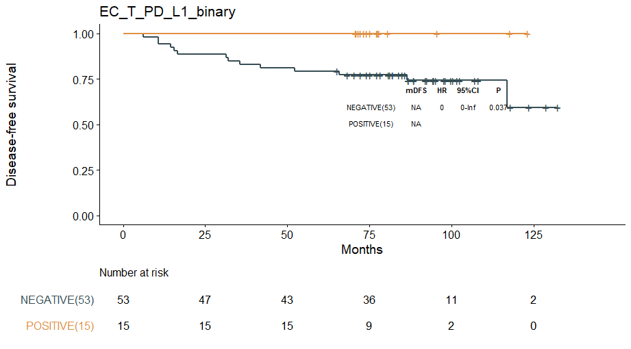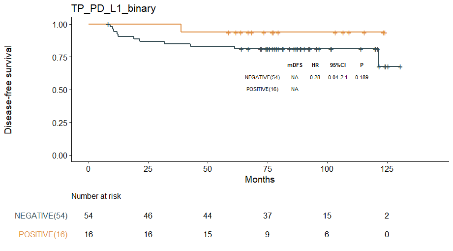 本研究入组138例患者均为手术治疗后的三阴性乳腺癌,术后分别予以TP方案或EC-T方案术后辅助化疗,两组5年DFS无显著性差异,通过分析PD-L1表达及肿瘤相关733个基因突变情况,我们发现PD-L1表达阳性患者预后更好,而TOP3A突变的患者预后更差。