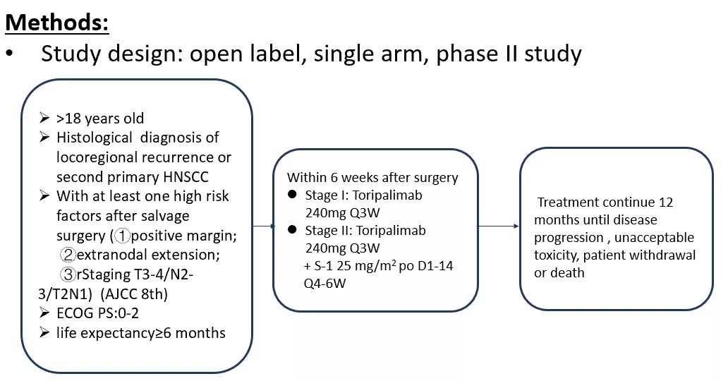 REPASS研究(NCT04126460)是一项单臂、Ⅱ期临床研究,旨在评估特瑞普利单抗(PD-1单抗)或联合替吉奥辅助治疗用于放疗后复发的头颈鳞癌挽救性术后患者的疗效及安全性。