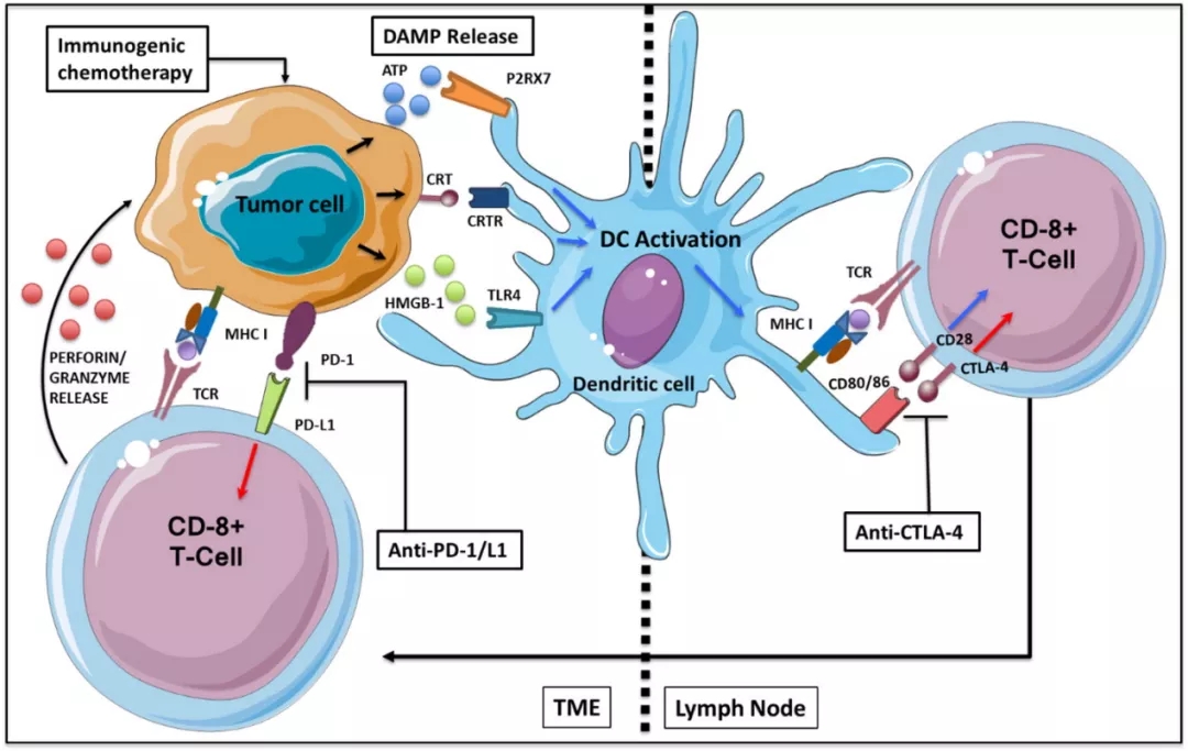 此外,2020年CSCO学术大会上也公布了卡瑞利珠单抗在胰腺癌治疗中的研究结果,卡瑞利珠单抗联合白蛋白结合型紫杉醇和吉西他滨一线治疗转移性胰腺癌,在12例进行疗效评价的患者中1例达到CR,8例达到PR,ORR达75%,DCR达83.3%;DoR:9例缓解的患者中,2例脱落,2例PD,其余5例目前仍持续PR。该项研究结果证实了卡瑞利珠单抗联合化疗的治疗模式对晚期胰腺癌患者的有效性(图2为免疫检查点抑制剂联合化疗的作用机制)。所以新型联合治疗方案的探索将有望开启晚期胰腺癌治疗的新模式。