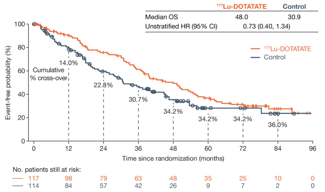 NETTER-1研究的治疗组和对照组后续进行随访或至少一种以上的系统性治疗,包括化疗、依维莫司、再次177Lu-DOTATAE PRRT或其他放射性配体介导的PRRT。最终,177Lu-DOTATAE组以11.7个月的OS优势胜于长效奥曲肽60mg对照组(48.0个月 vs 36.3个月),然而这样的成绩却并没有达到统计学意义(HR: 0.84,95%CI:0.6~1.17,P=0.30)。临床获益明显,但统计学上不显著,Statistics真是一门很玄妙的科学……