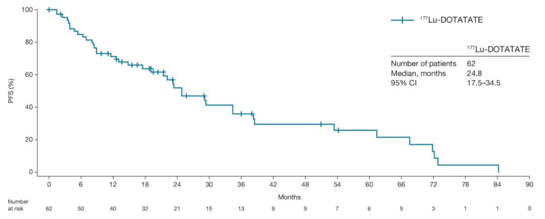大名鼎鼎的NETTER-1研究是一项III期国际多中心随机对照研究,入组的是不可手术的前期长效奥曲肽30mg治疗进展的中肠NET患者,治疗组为177Lu-DOTATAE+长效奥曲肽30mg,对照组为长效奥曲肽加量至60mg。该研究结果首次发布便荣登《新英格兰医学杂志》(N Engl J Med),以PFS(无进展生存期)为主要研究终点,28.4个月对比对照组8.5个月的优秀成绩惊艳NET治疗领域,直接推动了PRRT在European Commission 以及 FDA的正式获批,也奠定了PRRT作为GEP-NET诸治疗方案中的翘楚地位。