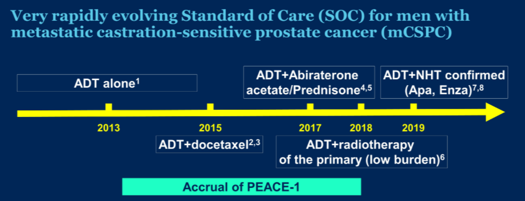 PEACE-1的初步研究提示,在新发mCSPC患者中,多种治疗机制早期联用的强化治疗方案可能显著增加的疾病控制,但我们还需要更长的随访时间来确定,去势治疗联用多西他赛及阿比特龙对于新发mCSPC患者的总体生存价值和长期安全性。