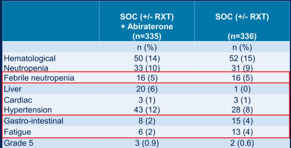 在PEACE-1研究的初步结果中,单纯去势治疗加多西他赛的PFS约为24个月,虽然不能直接比较,但是接近CHAARTEED研究中治疗组的27.3个月,在此基础上,再联用阿比特龙,能额外增加2.5年的中位PFS,体现了阿比特龙的额外生存优势,而且无明显的额外短期毒性,只是在肝毒性和高血压方面,联用阿比特龙可能略高一点。