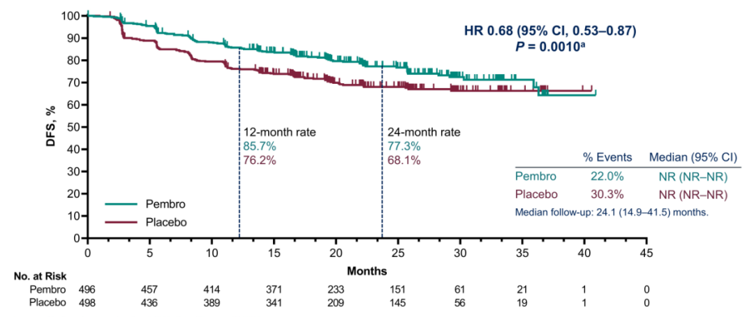 我认为(KEYNOTE-564)这些数据正在看到DFS的获益,且具有显著意义的HR(改善)。虽然最终的OS分析只需要26%的死亡事件,但这项研究的初步分析看到OS的HR是0.54,生存曲线也是呈分离的趋势。我认为这(OS显著获益)是非常令人放心的;虽然还不成熟,显然我们还需要更长时间的随访。