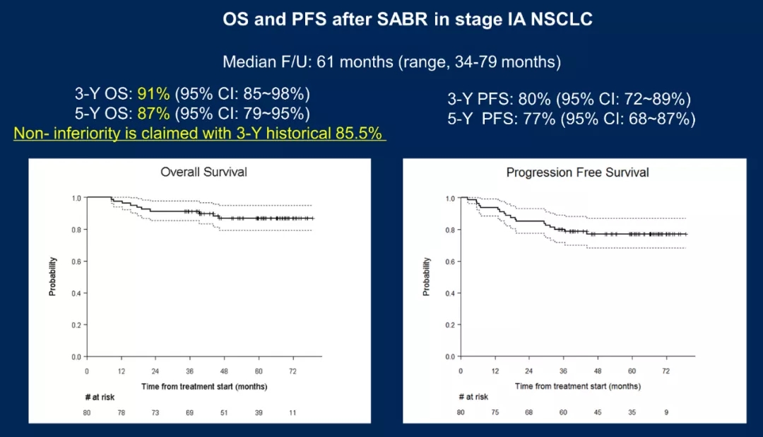 80例SABR患者的中位随访时间为61个月(范围:34-79个月)。3年OS和PFS分别为91%(95%CI:85-98%)和80%(95%CI: 72-89%),5年OS和PFS分别为87%(95%CI: 79-95%)和77%(95%CI: 68-87%)。将死亡作为竞争风险,5年累积复发率为:局部6.3%(95%CI: 2.3~13.2%)、区域12.5%(95%CI: 6.4~20.8%)和远处8.8%(95%CI: 3.8~16.2%)(任何复发17.6%[95%CI: 10.1~26.7%])。肺第二原发肿瘤的5年累积发生率为6.9%(95%CI: 2.5-14.6%);3级毒性反应占1.3%,无4-5级毒性反应;