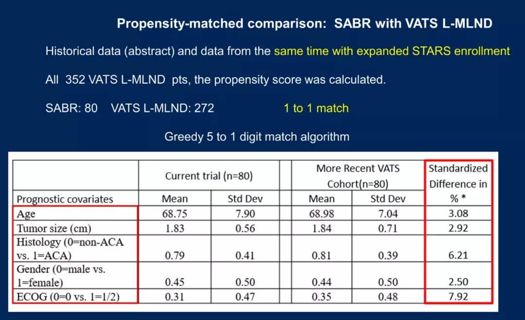 SABR与VATS L-MLND进行倾向评分匹配,协变量包括年龄、性别、肿瘤大小、组织学类型和ECOG PS;