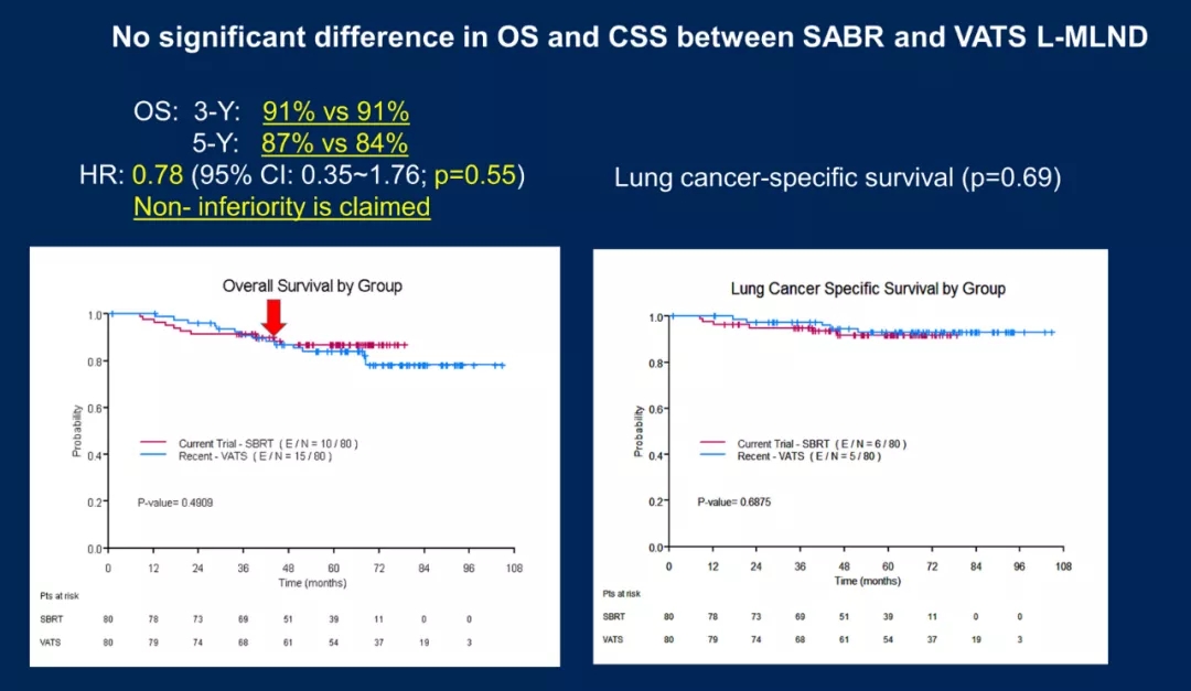 匹配评分后对两组进行比较,结果显示局部和远处控制失败的累积发生率无显著差异,SABR组的区域复发率更高。SABR组和VATS L-MLND组的OS和CSS无显著差异:3年OS率分别为91% vs 91%,5年OS率分别为87% vs 84%(HR=0.78; 95%CI:0.35-1.76, P=0.55)。PFS无显著差异:3年PFS率分别为80% vs 88%,5年PFS率为77% vs 80%(HR=1.29; 95%CI: 0.66-3.53, P=0.46)。