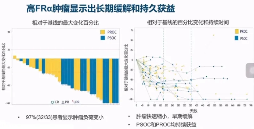 整体队列的ORR为50%,高FRa表达组ORR为64%(21/33),铂耐药卵巢癌(PROC)亚组59%(10/17),铂敏感卵巢癌(PSOC)亚组为69%(11/16)。整体队列的mDOR为9.7个月,高FRa表达组11.8个月,铂耐药卵巢癌亚组9.4个月,铂敏感卵巢癌亚组12.7个月。