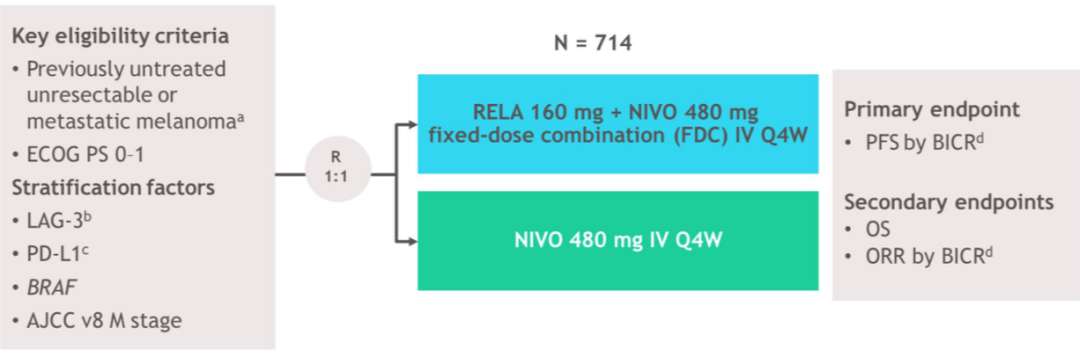 方法:既往未经治疗的晚期黑色素瘤患者按 1:1 随机接受 RELA 160 mg + NIVO 480 mg静脉输注 (IV) 或 NIVO 单药治疗 480 mg IV ,两组均为每 4 周给药一次,按 LAG-3 表达,PD-L1 表达、BRAF突变状态和 AJCC (v8) M 分期进行分层。主要终点是独立中心影像根据 RECIST v1.1 评价的无进展生存期 (PFS)。次要终点是总生存期和客观缓解率。预先指定亚组中的 PFS 和安全性是研究的额外目标。