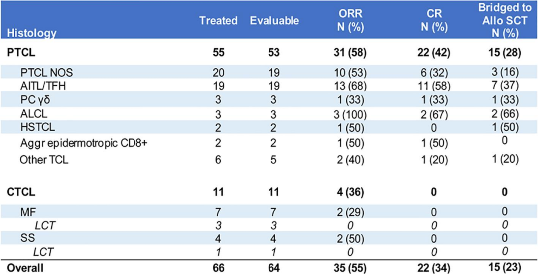 研究结果:共55例PTCL患者以及11例CTCL患者接受治疗。A组患者在Ⅰ期研究中并未出现剂量限制性毒性,故剂量水平3(Duvelisib 75 + 罗米地辛 10)被视为最大耐受剂量。在最大耐受剂量下,50/59例(85%)患者出现可能与研究药物有关的3-4级不良事件。其中10%以上患者中出现的≥3级不良事件为:中性粒细胞减少(36%)、腹泻(15%)、ALT/AST升高(14%)、血小板减少(10%)和感染(10%)。5例患者(9%)出现≥3级皮疹。10例仅接受Duvelisib导入治疗的患者中,4例(40%)出现≥3级ALT/AST升高,3/10例出现≥3级腹泻。相比之下,仅4/49例(8%)接受第1周期Duvelisib+罗米地辛联合治疗的患者出现3-4级ALT/AST升高,6/49例出现≥3级腹泻。64/66例患者可评估治疗疗效。ORR为55%(35/64),CR率为34%(22/64)。在PTCL患者中,ORR为58%(31/53),CR率为42%(22/53)。在CTCL患者中,ORR为36%(4/11),患者均为PR。起效的患者中,15/35例(43%)患者在中位4个周期的治疗后接受allo-SCT。患者的中位PFS为6.9个月(PTCL)与5.5个月(CTCL),中位DOR为8.1个月。4例患者在Duvelisib单药导入期治疗中CR,且未进行联合治疗,2/4例患者接受了SCT。