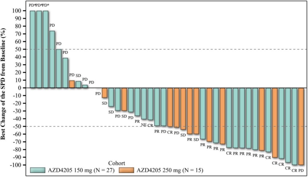 初步分析数据显示,41例(87.2%)患者治疗后出现不良事件(TEAE),其中24例(51.1%)患者出现≥3级TEAEs。据研究者评估,16例(34.0%)患者出现的≥3级TEAEs可能与DZD4205有关。最常见(>10%)的≥3级TEAEs包括血小板减少(23.4%)、中性粒细胞减少(17.0%)和肺炎(12.8%)。绝大多数TEAEs在药物剂量调整或不调整的情况下都是可控和可逆的。截至2020年12月7日,42例患者(150 mg, n = 27; 250 mg, n = 15)至少完成一次治疗后的疗效评估。150 mg药物剂量组中,14例患者显示肿瘤缓解,ORR为51.9%,其中6例(22.2%)患者为CR。250 mg药物剂量组中,6例患者显示肿瘤缓解,ORR为40.0%。不同亚型中均观察到肿瘤缓解。中位缓解持续时间(DoR)数据尚未可得,最长DoR>12个月。目前研究正在持续招募患者。