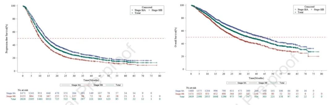 长期生存:整体人群的中位PFS为12.5个月,其中IIIa期为14.3个月,IIIb期为10.3个月;中位OS为34.9个月,其中,IIIa期为43.8个月,IIIb期为27.7个月;可切除的患者,中位PFS为19.9个月,中位OS为65.4个月;在不可切除的患者中,中位PFS和OS分别为10.6个月和25.0个月(图2)。