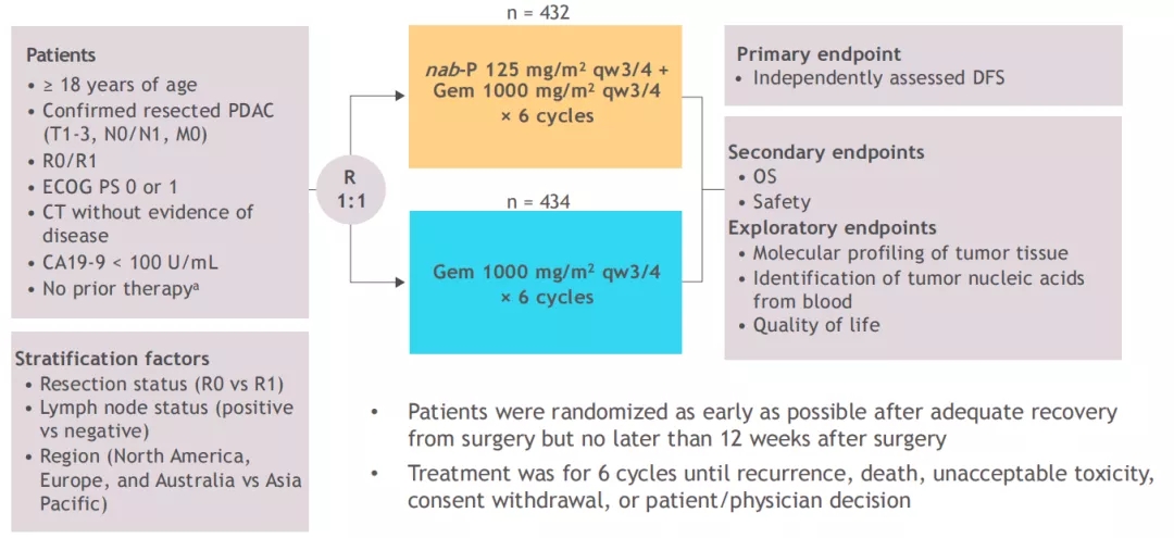 试验设计:患者纳入条件为经组织学证实的胰腺腺癌、肉眼完全切除(R0或R1)、东部肿瘤协作组表现状态为0或1、CA 19-9水平<100 U/ml的初治患者。分层因素包括切除状态(R0 vs. R1)、淋巴结状态(阳性vs. 阴性)和区域(北美、欧洲、澳大利亚vs. 亚太地区)。治疗于术后12周开始。患者接受nab-P 125 mg/m2 + Gem 1000 mg/m2治疗或Gem 1000 mg/m2单药治疗,第1、8和15天,28天为一个周期,共6个周期。主要终点是经独立审查的DFS,次要终点是OS和安全性。