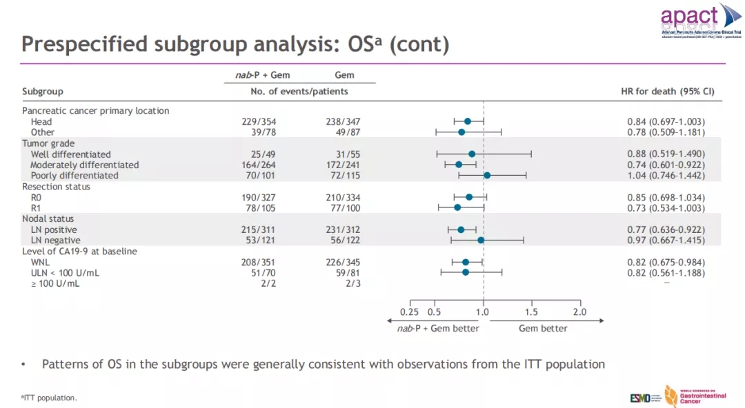 APACT研究是头对头比较白蛋白结合型紫杉醇+吉西他滨与吉西他滨单药作为已切除胰腺癌的辅助治疗的Ⅲ期研究,本次会议上公布了在意向人群中的5年OS结果。研究显示,在意向治疗人群中,双药辅助治疗组的中位OS为41.8个月,单药组为37.7个月,二组之间的差异达到了统计学意义(nominal P=0.0232)。对预先设定亚组的OS的分析结果与在意向治疗人群中的OS结果一致。因此,研究表明,双药联合辅助治疗优于单药。