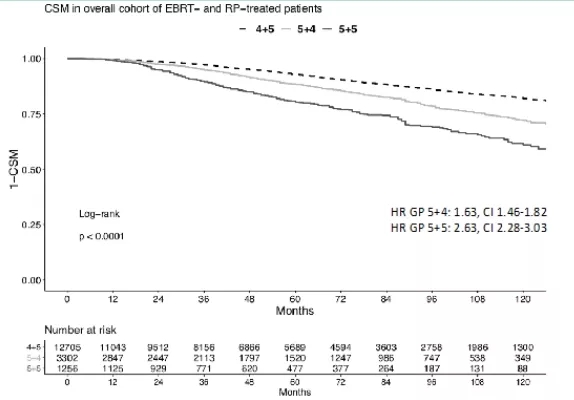 方法:按照Gleason评分模式4+5 vs. 5+4 vs. 5+5对数据分层。通过Kaplan-Meier、单变量和多变量Cox回归模型预测不同Gleason评分模式的CSM结局。按照EBRT和RP治疗类型进行亚组分析。